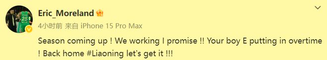 重新获得辽篮工作机会的莫兰德,很显然有些迫不及待,他自己宣布马上就会回来,和辽篮的队友们一起训练,还说还想帮助辽篮争冠。