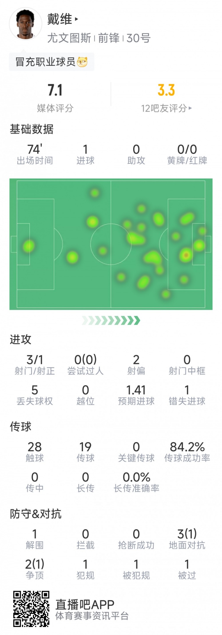 戴维本场数据:1粒进球,1次错失良机,3射1正,评分7.1分